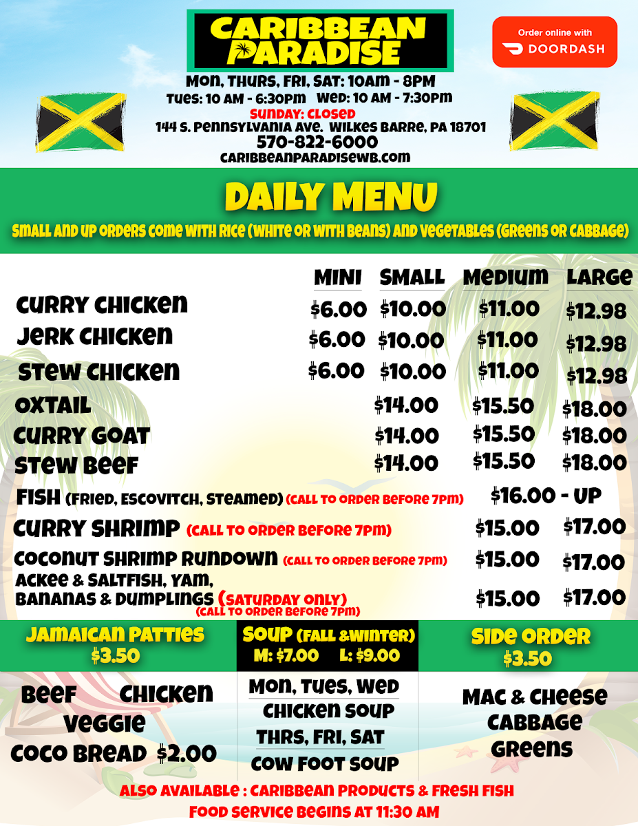 Nestled in Wilkes-Barre, PA, Caribbean Paradise serves up an authentic taste of the Caribbean with a menu that celebrates rich flavors and fresh ingredients. This takeout spot has garnered rave reviews for its delicious offerings, from melt-in-your-mouth oxtails to tender jerk chicken. Customers rave about the curry goat, which is perfectly spiced and paired beautifully with rice and beans.